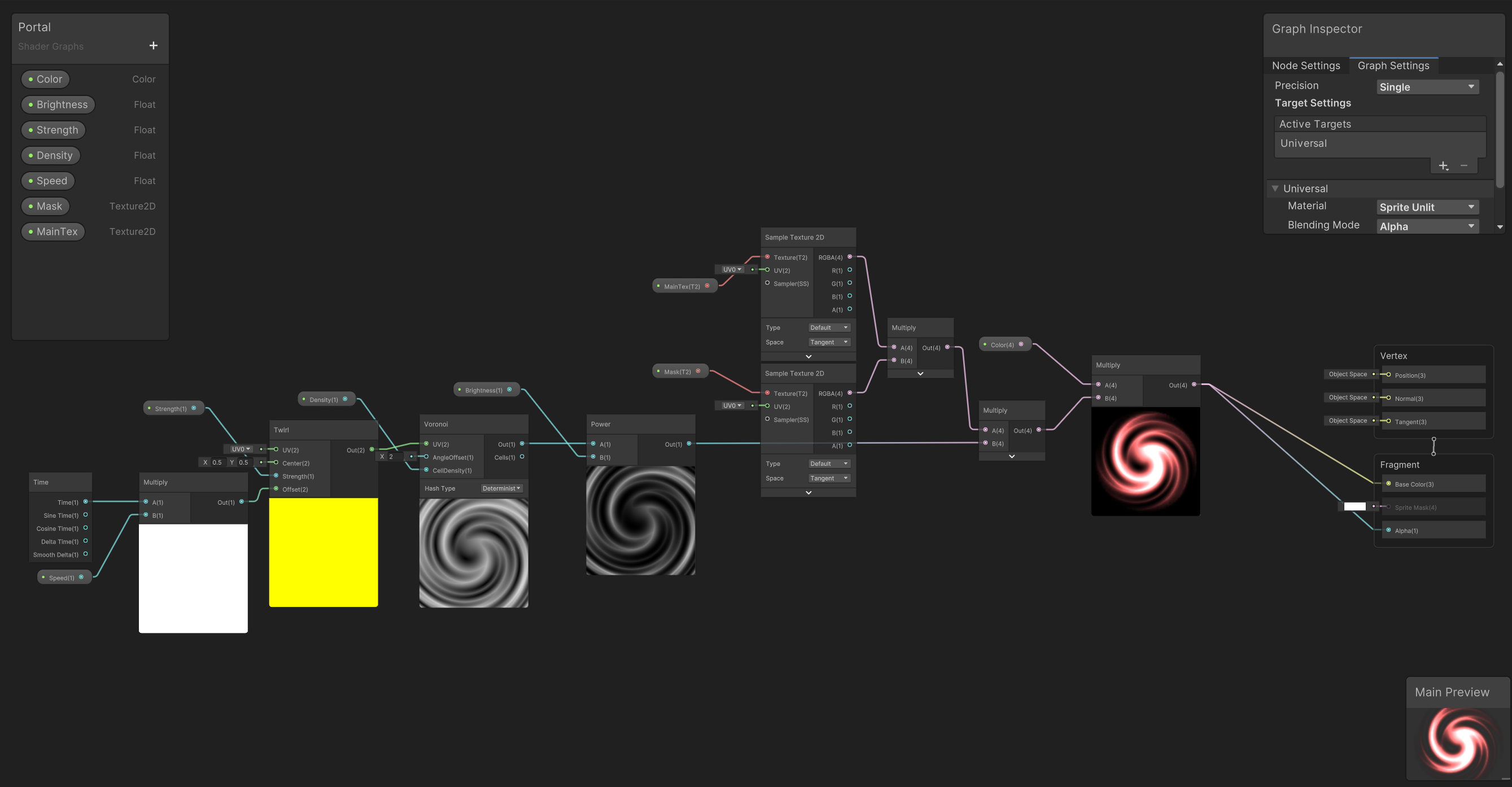 I had the plan to make a portal shader, to simulate a portal appearing throughout my game scenes, as a signifier to the end of each level / scene. Following this tutorial on YouTube, I ended up making this shader via shader graph, with the result looking like this: